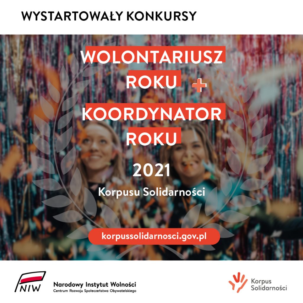 Konkurs Wolontariusz Roku i Koordynator Roku Korpusu Solidarności dofinansowany jest przez Narodowy Instytut Wolności – Centrum Rozwoju Społeczeństwa Obywatelskiego ze środków Programu Wspierania i Rozwoju Wolontariatu Długoterminowego na lata 2018 – 2030 Korpus Solidarności.