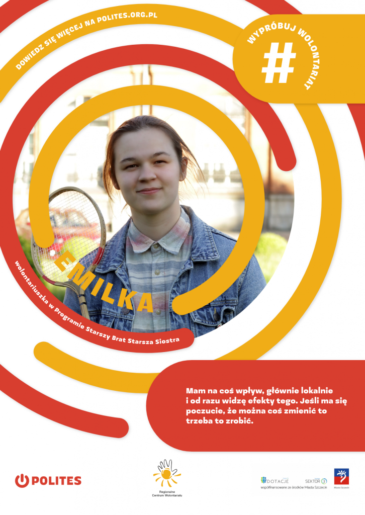 Jestem Emilka, jestem wolontariuszką w Politesie, w Programie Starszy Brat Starsza Siostra. Poza tym uczę się w szkole muzycznej, gram na perkusji i pracuję.